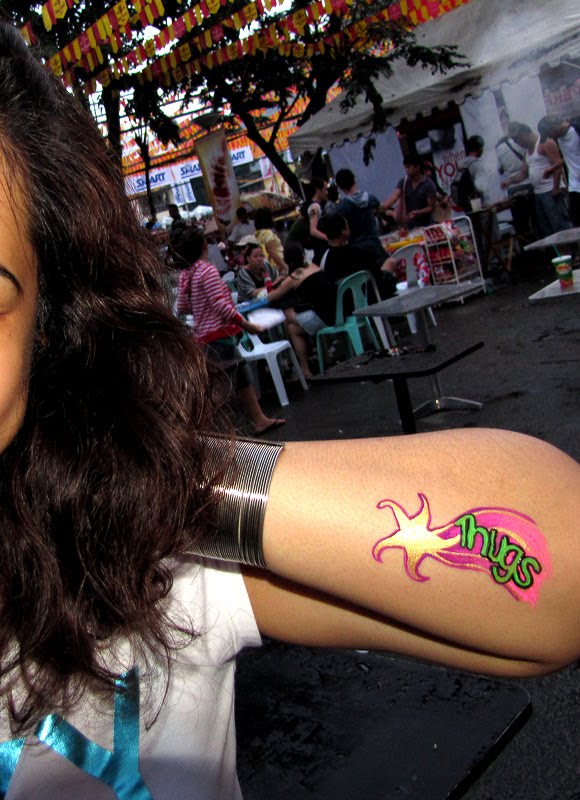 the family and i had our annual lunch at my tita’s (aunt’s) house in talamban and the above photos were taken on their steps. i couldn’t eat much because i was sick the whole night and had painful stomach spasms — almost had myself hospitalized if it weren’t for the thoughts of sinulog motivating me to get through it. i mean, i don’t want to miss the fun on the streets and stay couped up in a hospital room…after lunch, my friends and i hung out at a bar on the streets of mango, right near the actual sinulog parade… we did our own body painting (as seen below: my own painting of our group name right on my arm)… i took a few photos of the parade and the people (as much as i could manage since it’s very crowded)… then we walked to ayala cebu to have a picnic on the terraces grounds and watch the fireworks…i’m very proud to say that i got through this year’s festival SOBER…haha!