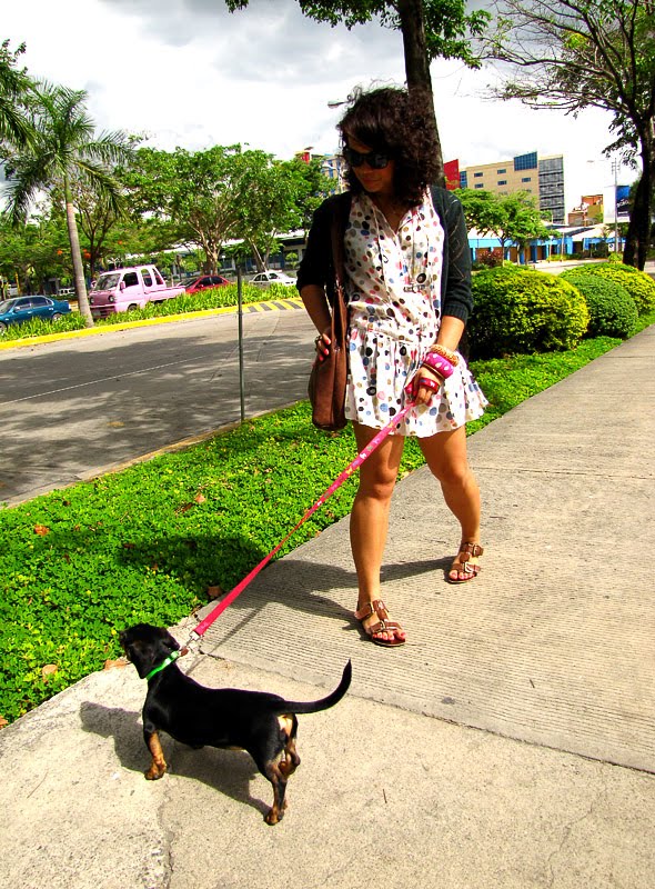 cute dog ! really love your polka dress ! and your sandals are fantastic !