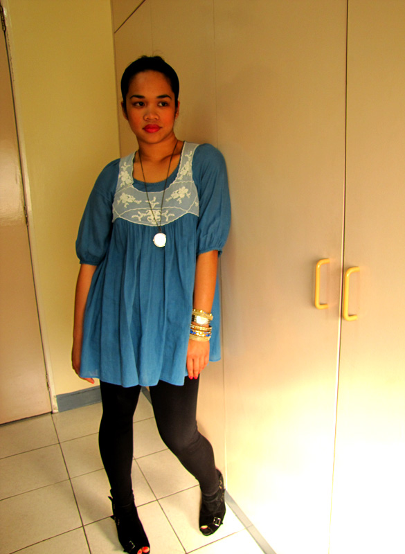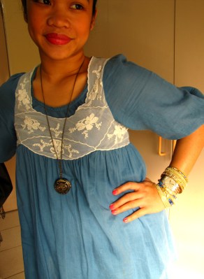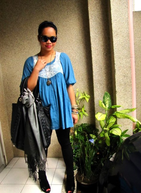 blue top with lace detail – mom’s closet | black leggings – ??? | black peep-toe booties – celine (gift from harry) | gold bangles – from india | work watch – swatch | owl necklace – manalili | black bag – lil’ sister’s | grey pashmina scarf – hk street vendor | sunnies – thrifted at carbon