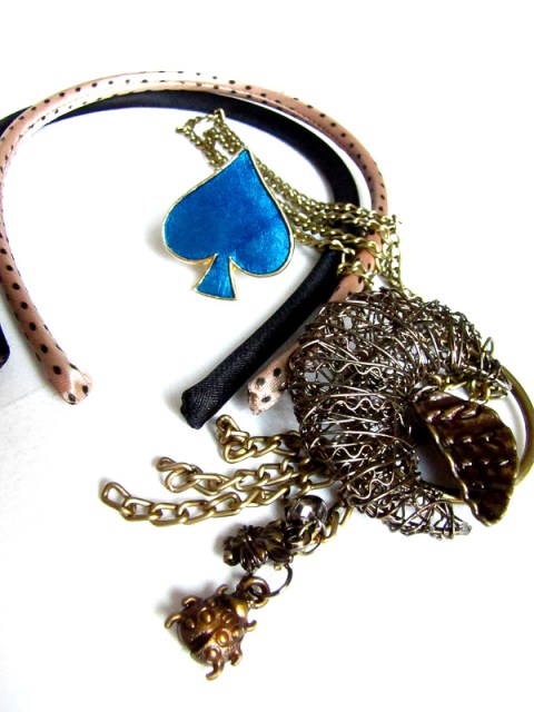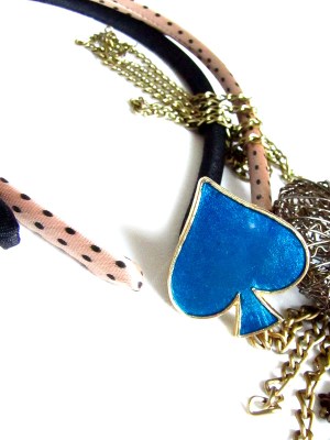 a long necklace with a wire pendant shaped like a moon, a blue spade ring and a couple of headbands (my love: polka!)