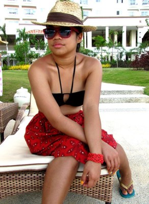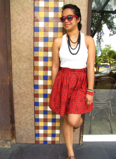 day 1: black halter bandeau – props | red printed high-waist skirt – thrifted | woven hat – boracay | green flip-flops – havaianas | pink sunnies – thrifted at manalili | black beaded necklace – a gift | coral bracelet – boracay | faux gold bangles – a gift
