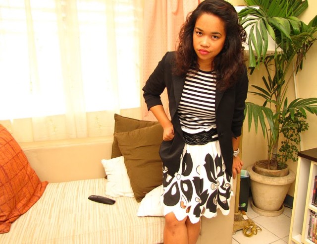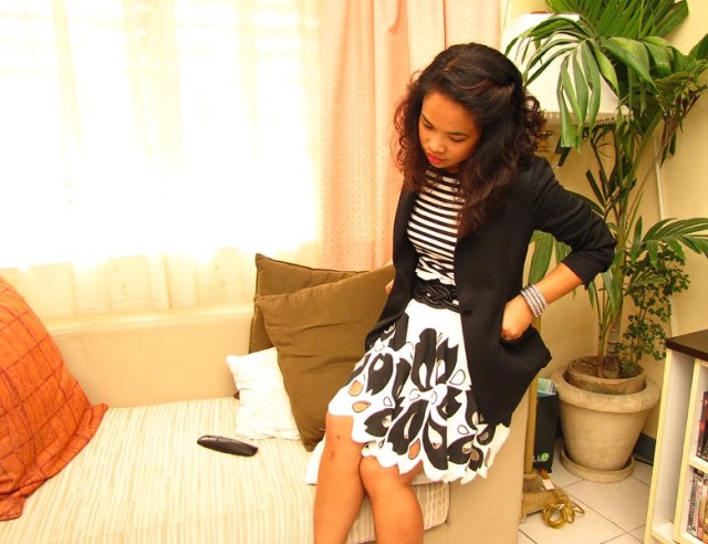 You look fabulous! I love the skirt and the black and white.