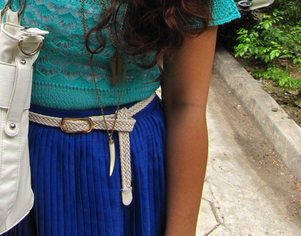 so i pulled out the brightest skirt i have — this bright blueish / periwinkle electropleated skirt that i thrifted months ago and looked for another bright colored item to pair with it. deep in the knitted and crocheted section of my closet, i found this green kimono type blouse that i was thankful i didn’t give away. voila! color blocking.