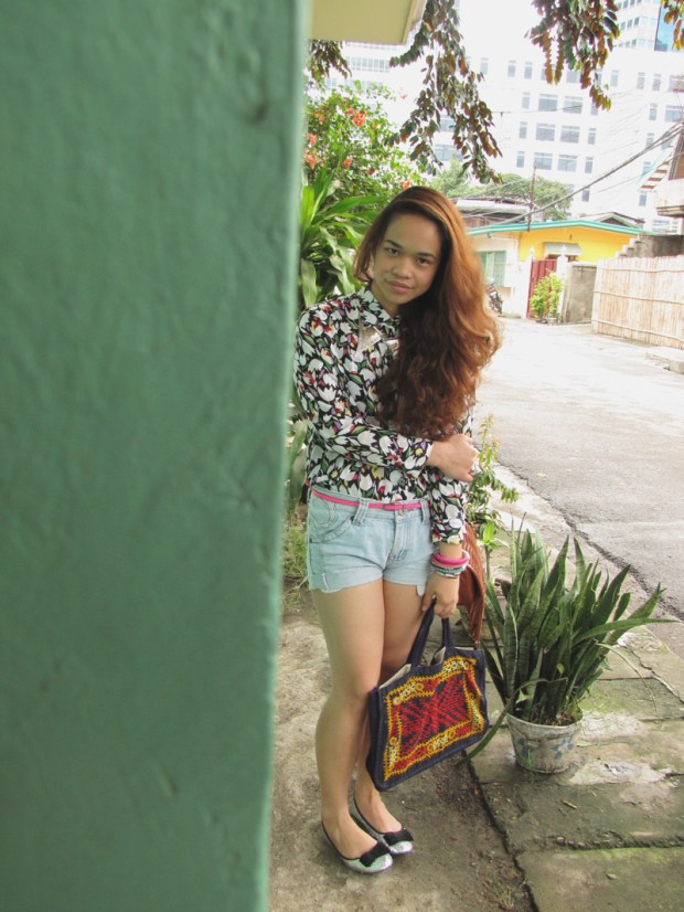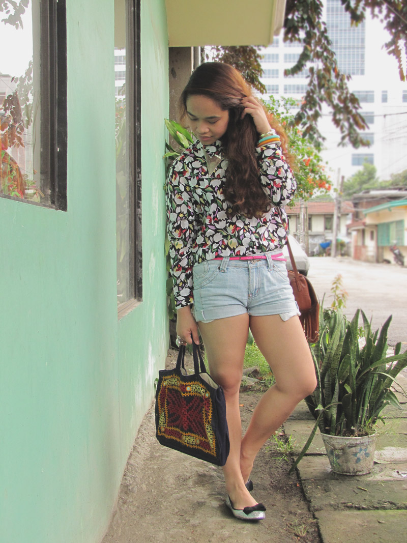 floral long-sleeved top – thrifted | denim cut-offs – thrifted | silver glitter flats – rubi, cotton on | neon pink belt – props | silver collar necklace – downtown find | camel fringe leather bag – urban originals | boho laptop bag – thrifted | bangles – braids and bonds