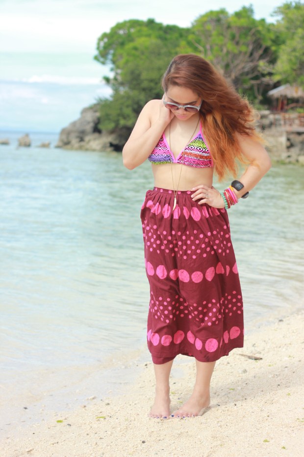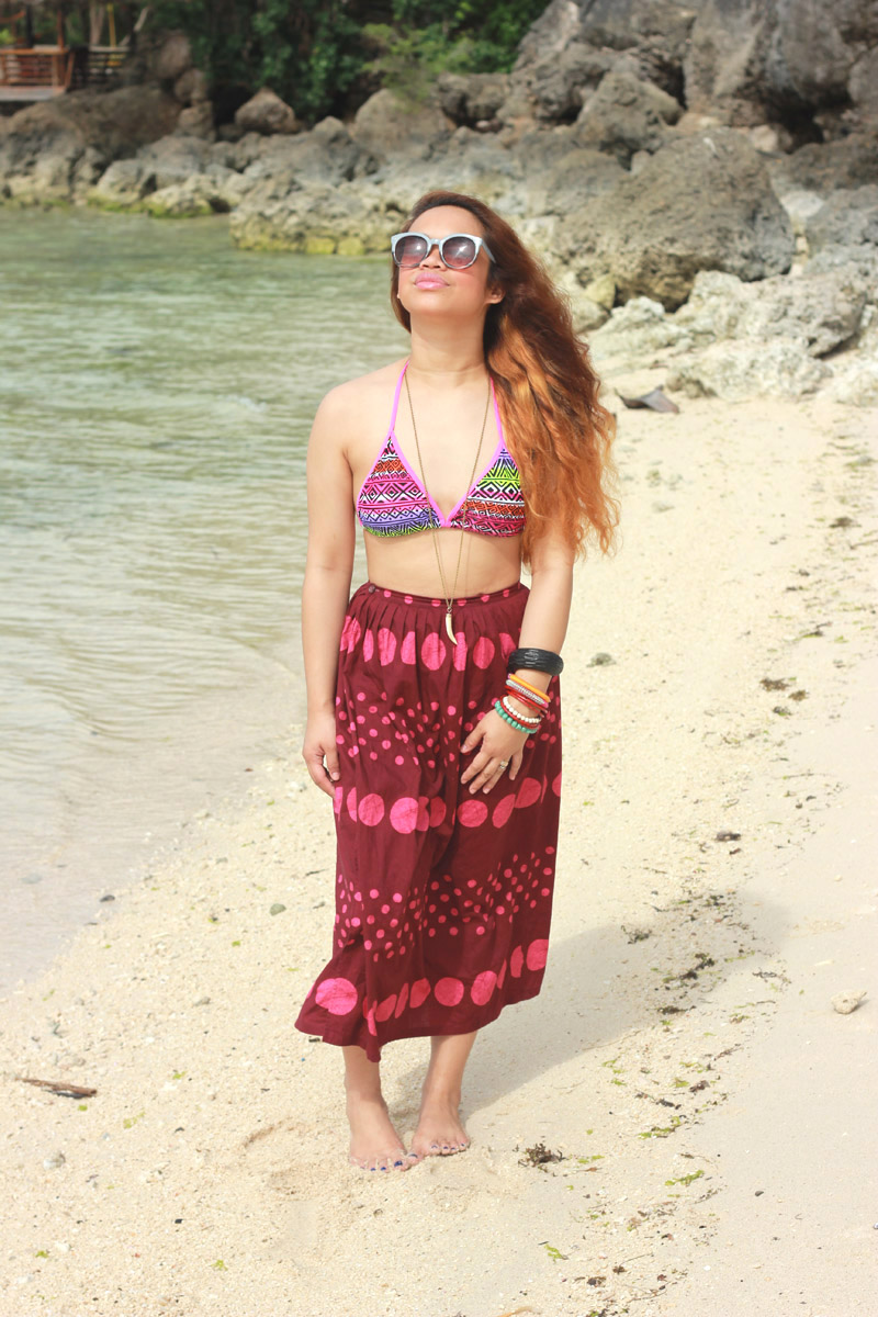 tribal printed swimsuit top – props | polka maxi wrap-around skirt – thrifted | elephant tusk necklace – bangkok find | oversized sunnies – urban outfitters, gifted by sister | bangles – braids and bonds & downtown finds