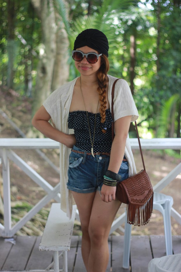 polka dot maillot – cotton on | high-waisted cut-offs – thrifted | knit cover-up – thrifted | black turban – bangkok find | tan fringed bag – urban originals | oversized sunnies – urban outfitters, gifted by sister | bangles – downtown finds | elephant tusk necklace – bangkok find | multi-colored braided belt – borrowed from sister