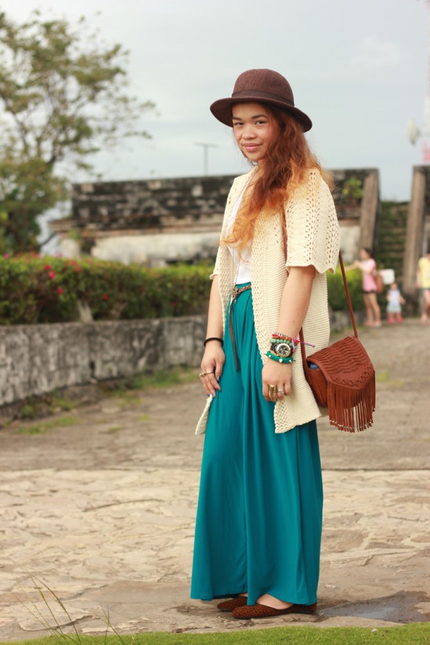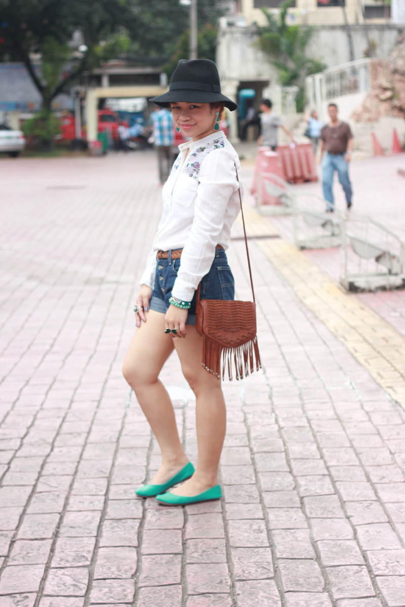 white button-down – props | denim cut-offs – tommy hilfiger | tan fringed leather bag – urban originals | turquoise flats – solemate, sm dept store | braided tan belt – props | black wide-brimmed hat – cotton on | geometric earrings – lovechic.ph | rings and bracelets – combined braids and bonds, downtown finds and gifts
