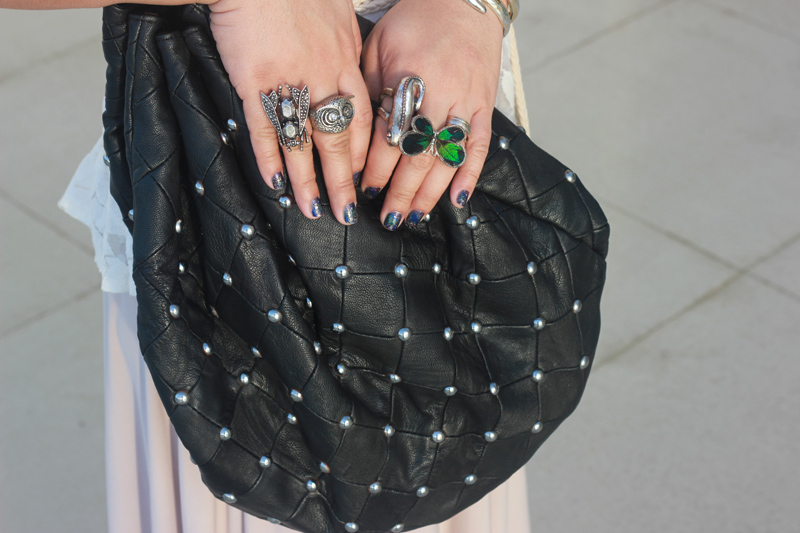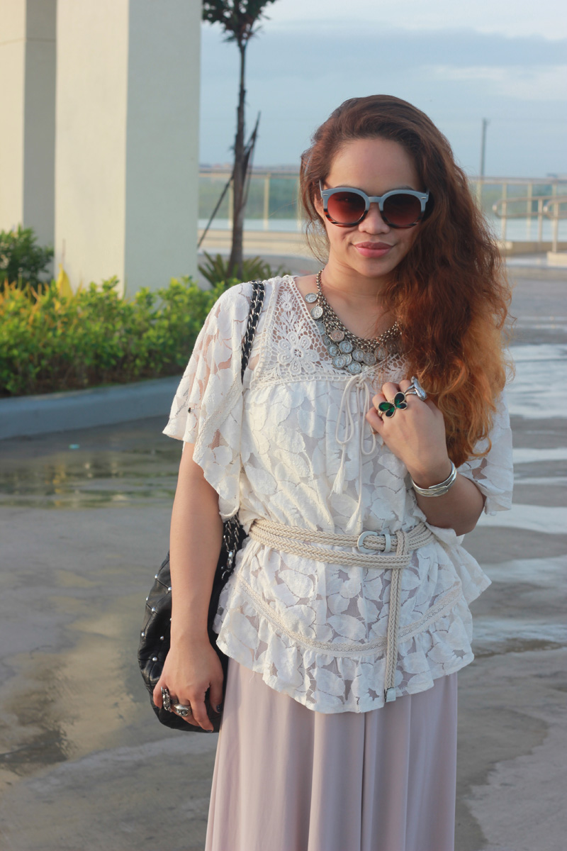 lace boho top – thrifted | pale lilac jersey maxi skirt – props | double braided belt – props | grey cotton flats – solemate, gifted by sister | black studded chain backpack – thrifted | coin necklace – pink pvssy bangkok | claw cuff bracelet – borrowed from mom | rings: wasp – downtown find, owl – gifted by a friend, gecko – pink pvssy bangkok, butterfly – accessorize, gifted by a friend