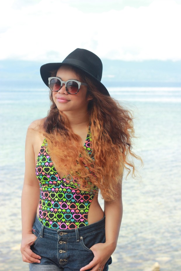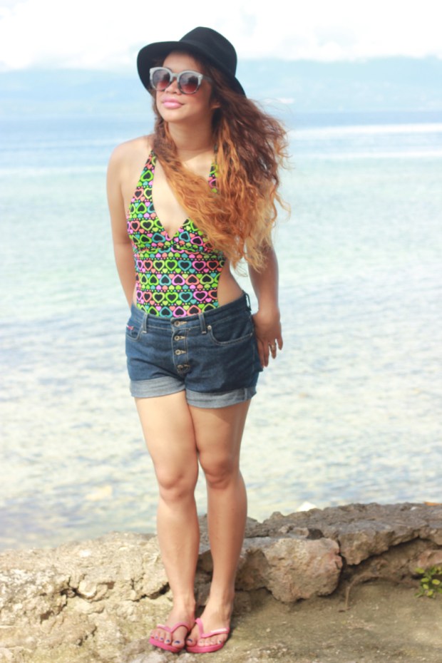 printed monokini – bangkok find | denim cut-offs – tommy hilfiger | pink flip-flops – havaianas | oversized sunniess – urban outfitters, gifted by sis | black wide-brimmed hat – cotton on
